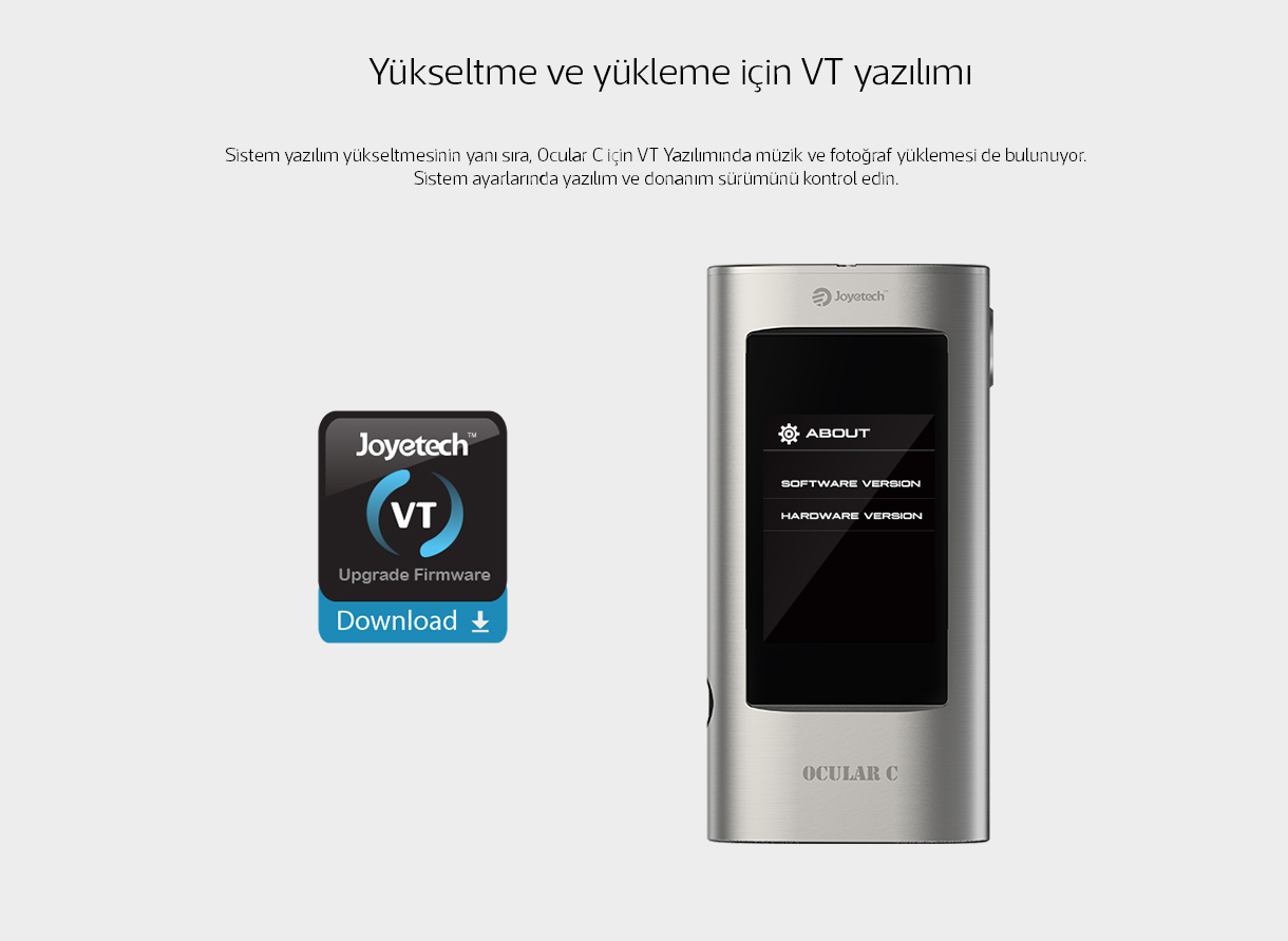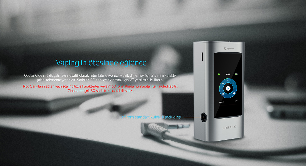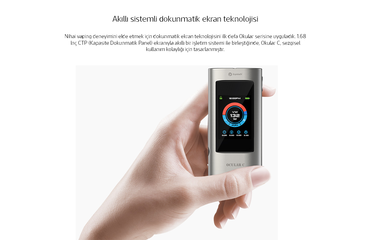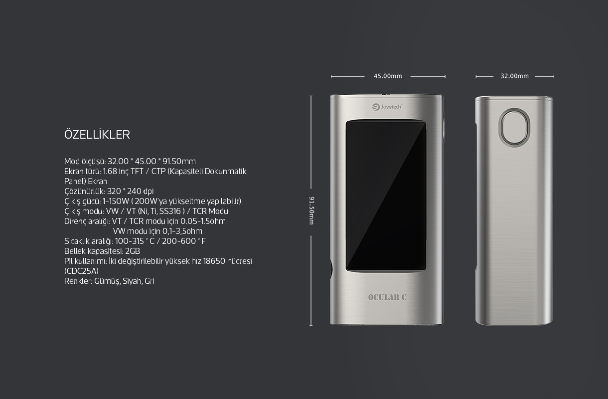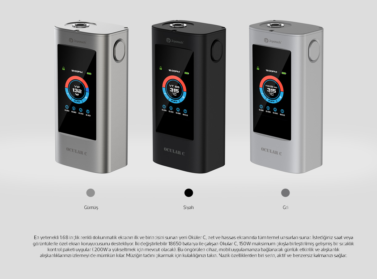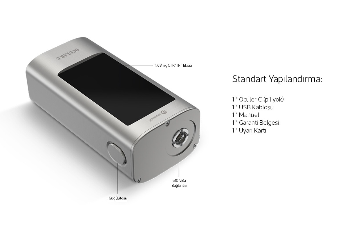 Sınırları Zorlayan Bir Mod Gövdeİsterseniz Joyetech Ocular C’nin sıradışı özelliklerine birlikte göz atalım. Bu sıradışı mod gövde 150 watt’a kadar çıkabilmektedir. Güncellendiğinde 200 watt’a çıkabilen Ocular C,1,68 inçlik TFT bir ekrana ve iki adet 18650 şarjlı pil yuvasına sahiptir. Joyetech Ocular C’nin üzerinde bulunan mikro usb girişi mod gövdenin rahatlıkla şarj olmasın ı sağlar buna ek olarak mod gövdenin üzerindeki 3,5 mm’lik jak girişi ise mod gövdenin aynı zamanda sizlere şarkı çalabilmesini de sağlar.Müzik Çalar Ve Video Özelliği!Joyetech Ocular C tam bir mod elektronik sigara gövdesidir. Bu mod gövde mp3 çalmaktan fotoğraf ve video göstermeye kadar pek çok işlevi yerine getirebilir. Joyetech Ocular C,çok farklı özellilklere sahiptir. Mod gövdenin üzerinde bulunan ekran dokunmatiktir ve gerektiğinde saat gerektiğinde ise çekim sayacı haline gelebilir. Bu harika özelliklerine rağmen oldukça makul boyutlara sahip olan Joyetech Ocular C,muhteşem özellikleriyle sizleri sitemizde bekliyor. Gövdesinin üzerindeki mikro usb girişi sayesinde yazılımı güncellenebilen,çekim sayınızı ve saati gösterebilen yüksek kapasiteli bir mod gövde arıyorsanız Joyetech Ocular C’yi sakın kaçırmayın. Dikkat:Joyetech Ocular C Bir Mod Gövdedir. 18650 Şarjlı Piller Ve Atomizer Tank Ürün İçeriğine Dahil Değildir.Joyetech Ocular C Kutu İçeriği: