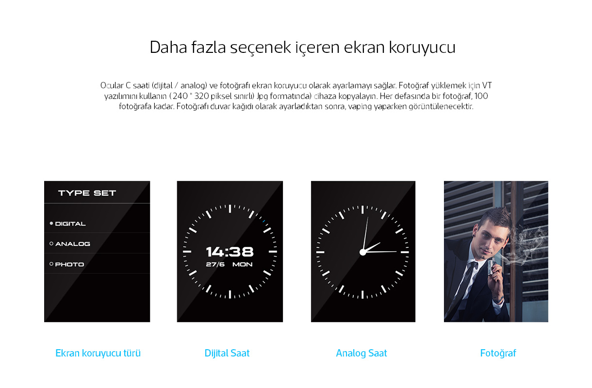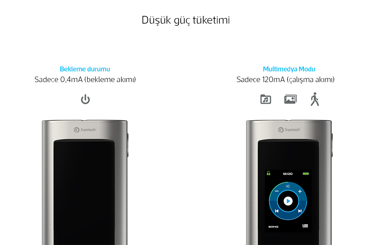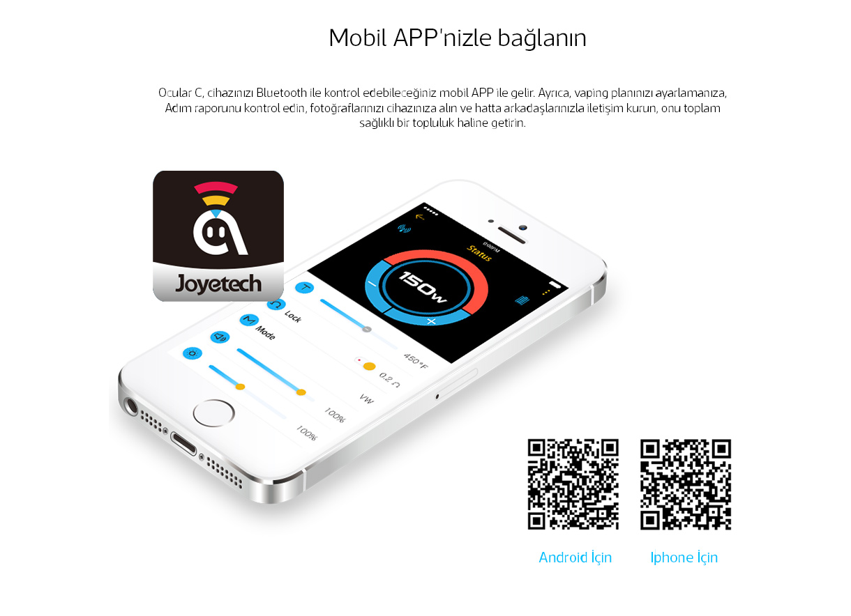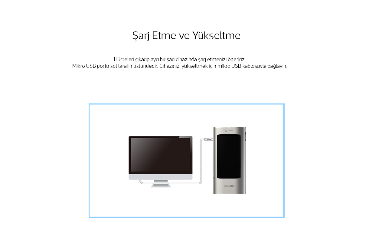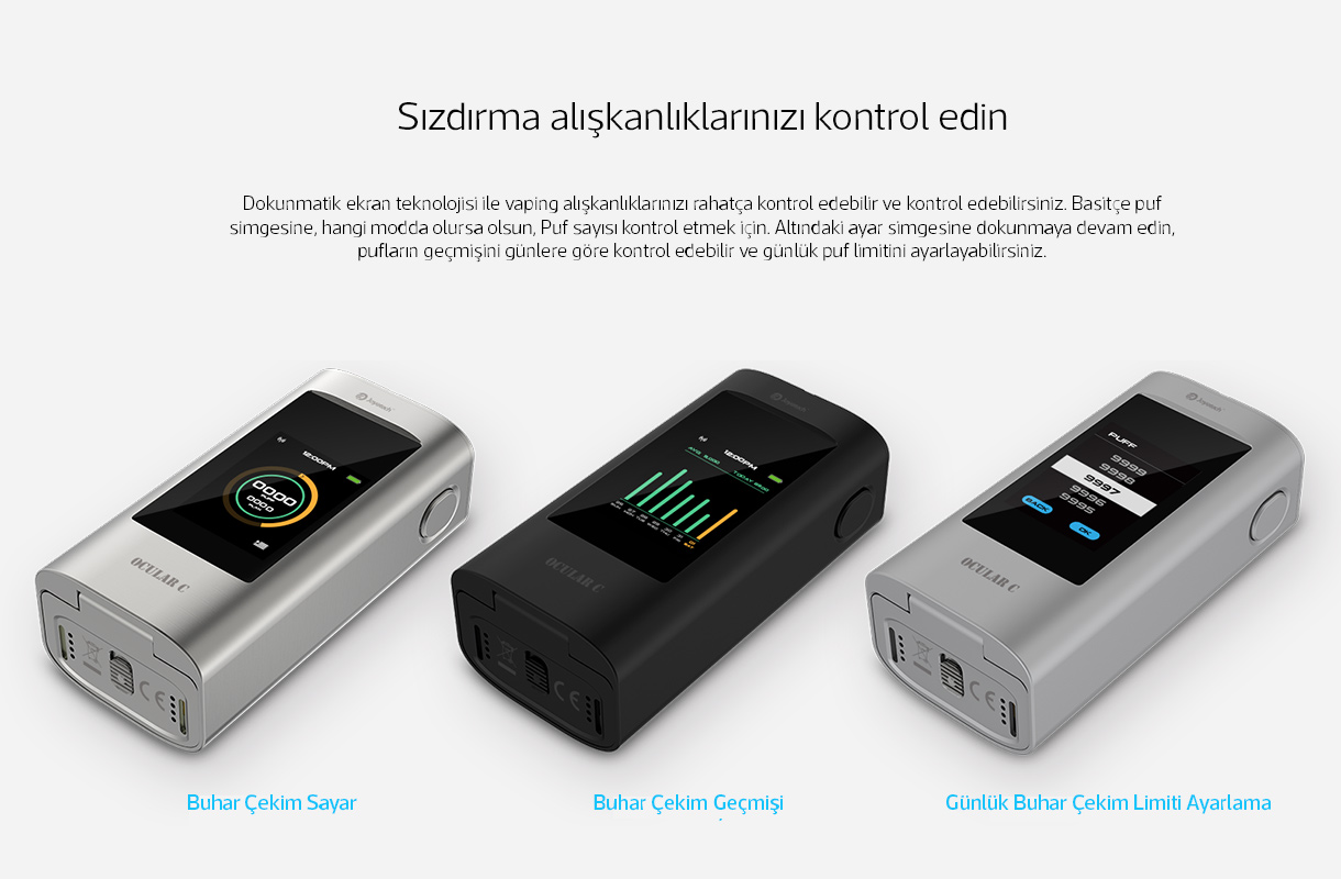 Sınırları Zorlayan Bir Mod Gövdeİsterseniz Joyetech Ocular C’nin sıradışı özelliklerine birlikte göz atalım. Bu sıradışı mod gövde 150 watt’a kadar çıkabilmektedir. Güncellendiğinde 200 watt’a çıkabilen Ocular C,1,68 inçlik TFT bir ekrana ve iki adet 18650 şarjlı pil yuvasına sahiptir. Joyetech Ocular C’nin üzerinde bulunan mikro usb girişi mod gövdenin rahatlıkla şarj olmasın ı sağlar buna ek olarak mod gövdenin üzerindeki 3,5 mm’lik jak girişi ise mod gövdenin aynı zamanda sizlere şarkı çalabilmesini de sağlar.Müzik Çalar Ve Video Özelliği!Joyetech Ocular C tam bir mod elektronik sigara gövdesidir. Bu mod gövde mp3 çalmaktan fotoğraf ve video göstermeye kadar pek çok işlevi yerine getirebilir. Joyetech Ocular C,çok farklı özellilklere sahiptir. Mod gövdenin üzerinde bulunan ekran dokunmatiktir ve gerektiğinde saat gerektiğinde ise çekim sayacı haline gelebilir. Bu harika özelliklerine rağmen oldukça makul boyutlara sahip olan Joyetech Ocular C,muhteşem özellikleriyle sizleri sitemizde bekliyor. Gövdesinin üzerindeki mikro usb girişi sayesinde yazılımı güncellenebilen,çekim sayınızı ve saati gösterebilen yüksek kapasiteli bir mod gövde arıyorsanız Joyetech Ocular C’yi sakın kaçırmayın. Dikkat:Joyetech Ocular C Bir Mod Gövdedir. 18650 Şarjlı Piller Ve Atomizer Tank Ürün İçeriğine Dahil Değildir.Joyetech Ocular C Kutu İçeriği: