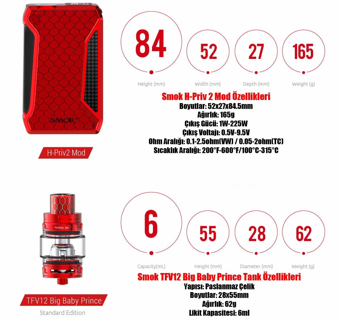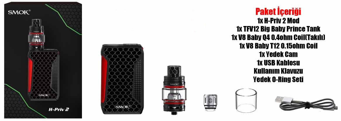 Orijinal H-PRIV ile aynı bir epik sürüm olan SMOK H-PRIV 2 225W Starter Kit,TFV12 Big Baby Prince Tank ile güçlendirilmiş yüksek performanslı ve görsel olarak çarpıcı tasarıma sahip olan mükemmel bir elektronik sigara. SMOKTech'in endüstrileşmiş üretim ve tasarım yeteneğinin zirvesini özetleyen H-PRIV 2 225W kit,zarif bir kobra tasarım desenleri,karbon fiber ve yanal ateş butonu ile oldukça dikkat çekiyor. Şasinin geri kalanı,2 adet 18650 elektronik sigara pili (ayrı olarak satılır) ile çalışmakta. Smok H-Priv 2 Kit 225W,şirketin en modern teknolojisini entegre etmek için tasarlanmış olup,ayrıntılı pil durumundan ve çıkış ayarlarından,canlı ekrana bir bakışta temel veriler sağlayan,gerçekten özelleştirilebilir ve kullanıcı dostu renkli bir OLED ekranı sunar. .Yeni TFV12 Big Baby Prince Tank Alt-Ohm Tankı maksimum 6 ml kapasitesi bulunmakta.