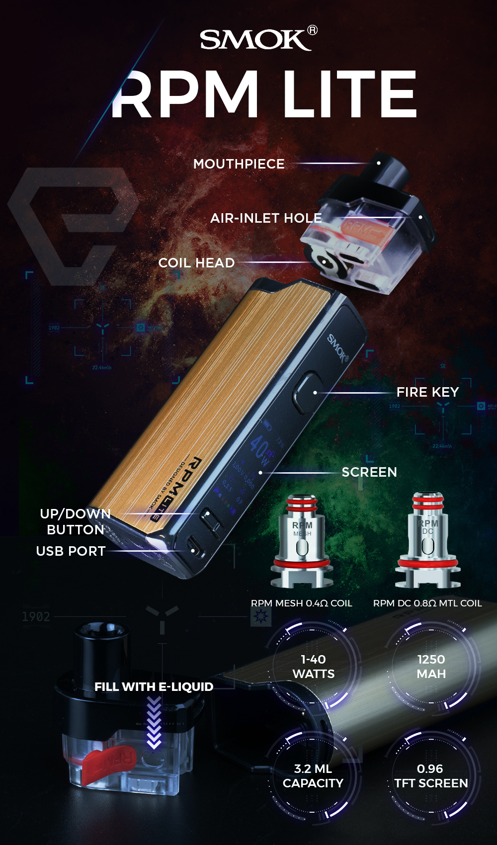 Smok RPM Serisinin ürünü olan RPM LİTE tüm rpmler gibi RPM Serisi coil kullanır ve 40W güce kadar çalışır.İnce boyutu ve kibar tasarımı ile oldukça taşınabilir bir ürün olmakta olan rpm lite,1250 mah bataryası sayesinde gün boyu oldukça rahat kullanılabilir.3.2 ml tank kapasitesine sahiptir.