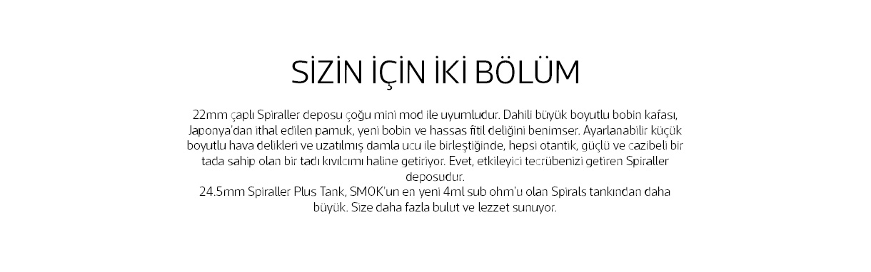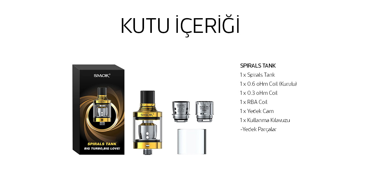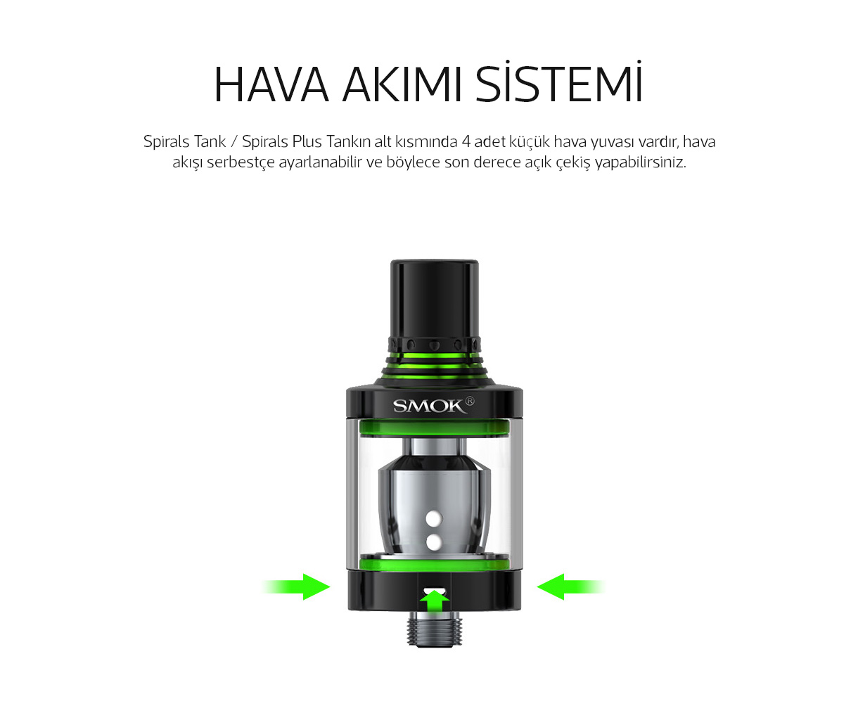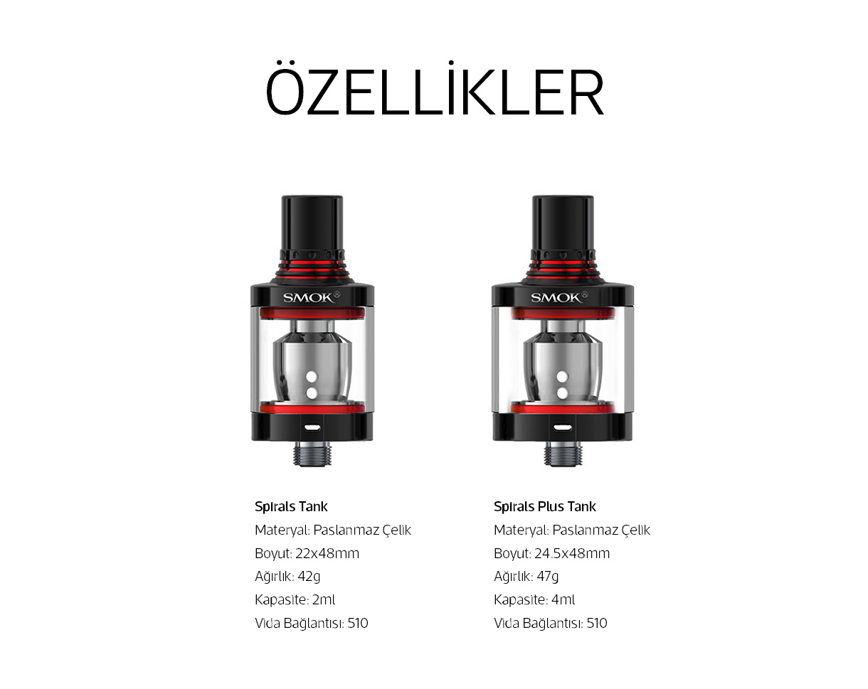 Smok markasının atomizeri olan spirals 2ml tank kapasitesine sahip bir atomizerdir.Başlangıç kullanıcıları için oldukça uygun bir üründür.